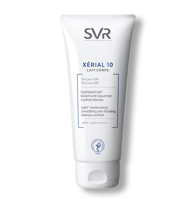 INDICATIONS : le lait corps XERIAL 10 de SVR est destiné aux peaux très sèches et sujettes aux squames.
